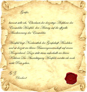hiermit stelle ich, Ebenhart,der derzeitige Anführer der Einsiedelei Hersfeld, den Antrag auf die offizielle Anerkennung der Einsiedelei.